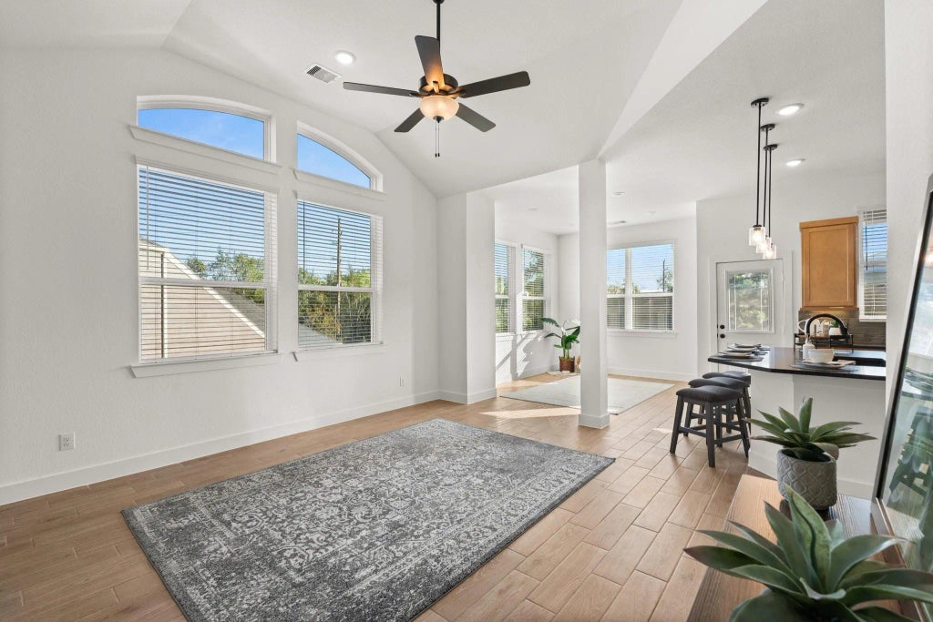 Enjoy this stunning 2-story, 3-bedroom, 2.5-bath home offering 1,878 sq. ft. of thoughtfully designed living space. Featuring a 2-car garage and a versatile downstairs flex room, this home combines functionality with modern elegance. Two spacious bedrooms are located downstairs and share their own private flex space—ideal for a kids’ play area, media room, home office, or multigenerational living. Upstairs, the private primary suite offers a peaceful retreat with ample space and natural light. The open-concept upstairs living area includes a covered balcony conveniently located near the kitchen—perfect for morning coffee or evening sunsets. The chef-inspired kitchen showcases white cabinetry throughout, white quartz Calacatta Adonia countertops, and flows seamlessly into the living room with a cozy electric fireplace. Upgrades include natural wood-look tile in main living areas, plush upgraded carpet with ½" pad in bedrooms and closets, and stylish finishes throughout.
