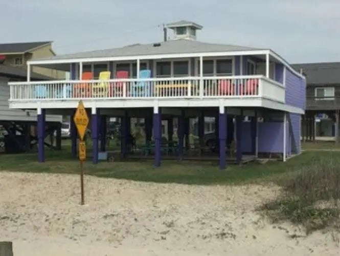 Charming Oceanfront Beach House! Just imagine yourself sitting on the wrap-around, partially covered deck listening to the relaxing sounds of the ocean while watching everyone play on the beach! The entrance stairway is enclosed which makes it nice if it’s dark, windy or rainy. The large living/dining area has a unique system of sunburst beams on the ceiling, tiled floors, custom walls and boasts 180 degree views from the many large windows. The kitchen ceiling is equipped with a lovely “lighthouse” feature, when lit up at night resembles a lighthouse from outside. This comfortable beach home is a successful vacation rental with 2 large bedrooms and 2 bathrooms and is set up to sleep up to 14 people. The primary bedroom has custom painted nautical-looking walls and accents. The main bathroom has bead board walls, a custom tiled tub surround and it opens up to a large laundry room. The second bedroom has an en suite bath and is set up to sleep 6,
