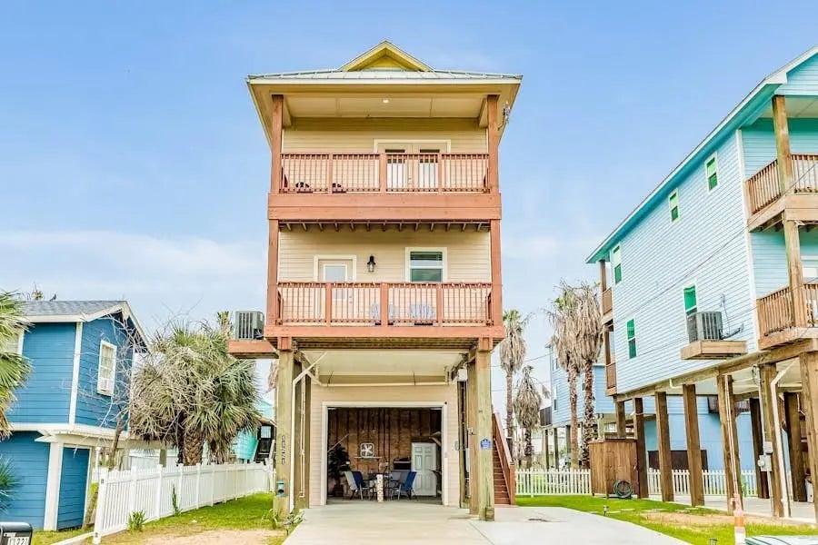 Welcome to Peach on the Beach! This charming 2-bedroom, 2-bathroom, two-story home is just minutes from the shore, offering the perfect beach lifestyle. With four balconies—two on each level—you can enjoy cool coastal breezes, stunning sunsets on one side, and beach views on the other. The main living space is located on the first level, featuring a bright and open floor plan. The full kitchen is ideal for cooking up your favorite meals or making a quick snack while you relax and watch the sunset. Upstairs, you'll find the two bedrooms and bathrooms, plus a convenient laundry area in the hallway. Each bedroom has access to one of the upper balconies, so you can step out and enjoy the fresh air from any room. On the ground level, there’s a lovely outdoor dining area perfect for al fresco meals, as well as an outdoor shower to rinse off after a day at the beach. Plus, you’ll have a one-car garage for added convenience. 4.3 miles to Moody Gardens, 8.1 miles to downtown Galveston.