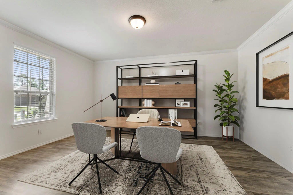 This beautiful one-story home is ideally located near HWY 105 and I-45, just minutes from Lake Conroe, in the desirable Woods of Conroe community. The freshly painted interior showcases an open floor plan featuring a light, bright kitchen with stainless steel appliances, custom backsplash, under-cabinet lighting, and an oversized island topped with quartz countertops. Luxury vinyl flooring runs throughout the main areas for easy maintenance, while plush carpet adds comfort to secondary bedrooms. The private primary retreat is tucked away at the back of the home. The spacious en-suite bathroom includes a walk-in shower, garden tub, dual sinks, and a large walk-in closet. Two secondary bedrooms share a full bath, and a dedicated home office at the front of the home. Out back, enjoy a private fenced yard with a covered patio and a deck— ideal for relaxing or hosting guests. Don’t miss this one — schedule your showing today!