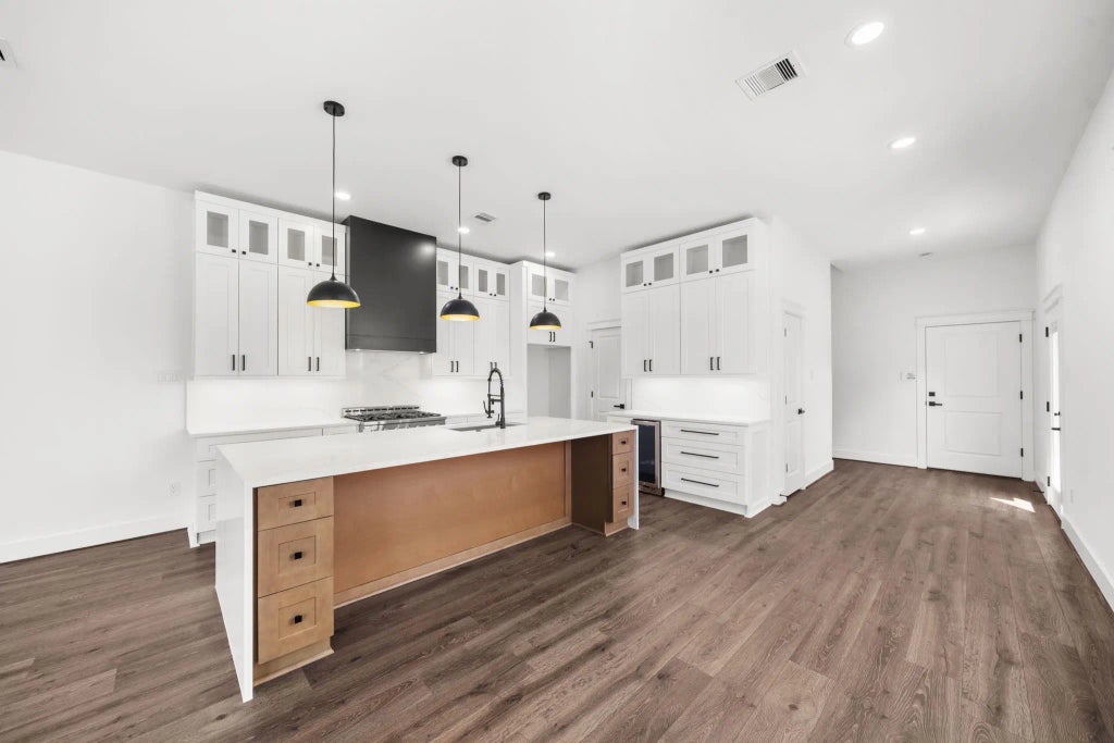 Beautifully designed new construction built by Brunson Home Builders completed and ready for move in situated on a spacious corner lot with easy freeway access. 10 foot ceilings throughout, open concept kitchen showcases quartz waterfall island, ceiling height cabinetry with under counter lighting and plugs, full quartz and custom vent hood, 36 inch commercial gas range, beverage and regular refrigerator. Powder room located off kitchen, waterproof laminate flooring throughout, security system with cameras, speakers in living area, high efficiency A/C, porcelain tile bathrooms are among the homes quality finishes. Primary suite offers spa like bath with soaking tub, separate shower and large custom walk in closet. Laundry room with stackable washer/dryer included. Balcony off primary suite and fenced grassy side yard, motorized driveway gate and additional parking enclosed with 7 foot privacy fence - ideal for relaxing or entertaining.