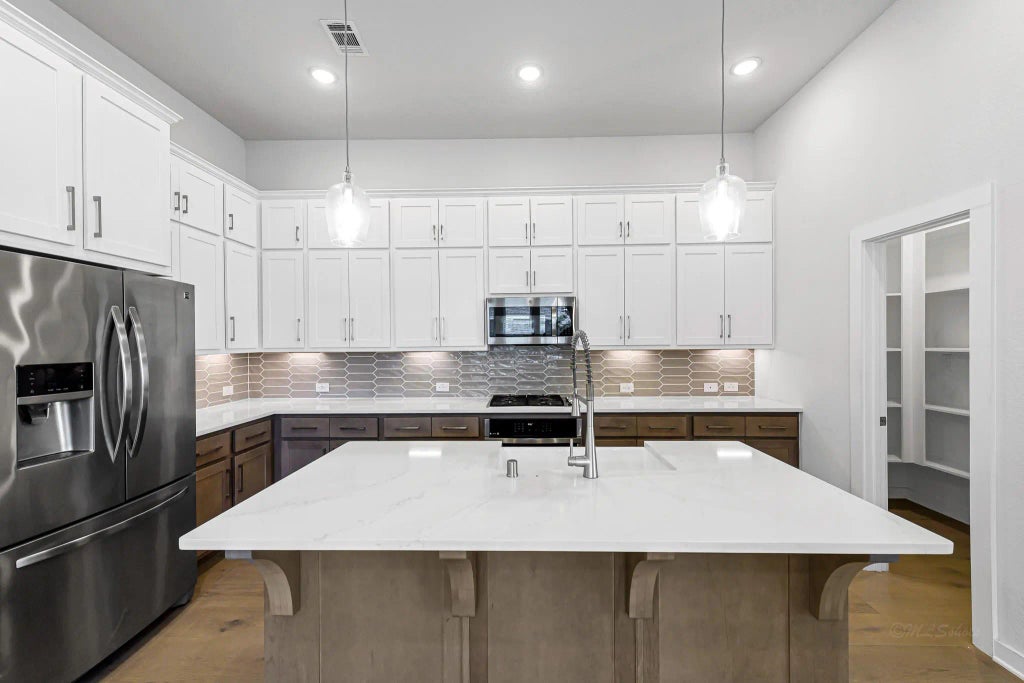 Welcome to your next home, where everyday life feels like a retreat! This 3-bedroom, 2-bath house offers nearly 2,000 square feet of thoughtfully designed living space with an open concept layout perfect for both relaxing and entertaining. Built by Highland Homes, it features 11-foot ceilings & a bright, airy feel throughout. The kitchen island steals the show with a large farmhouse sink, quartz countertops, walk-in pantry, & plenty of prep space—ideal for aspiring chefs or snack enthusiasts. The primary bedroom includes a wall of beautiful windows overlooking the vast back yard, spacious walk-in closet, and connects to a private bath for added comfort. Enjoy the benefits of solar panels with no current electric bill and keep the yard green with a full sprinkler system. Sitting on a huge lot and just a short stroll from the Lazy River Complex in Sunterra, this home offers a great blend of comfort, convenience, and fun. It's your ticket to low-maintenance living & summertime splashes.