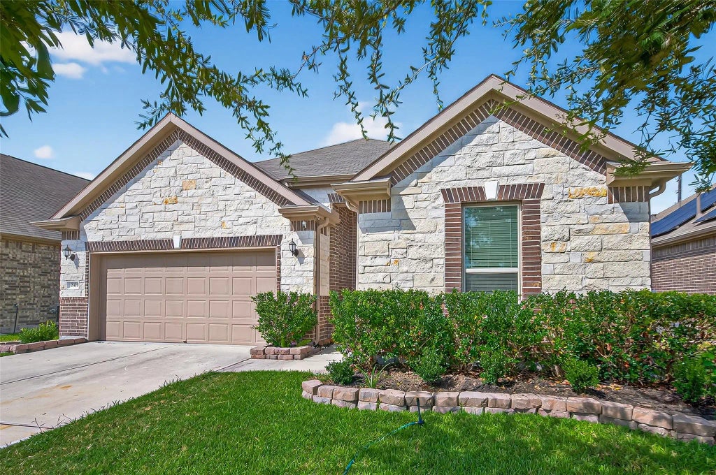 Immaculate 3-bedroom home with durable brick and stone elevation, open-concept living and abundant natural light! Features smart EcoBee thermostat, recessed lighting, wood tile floors, updated fixtures, shutters, and a remote-control fan. Kitchen boasts easy-to-clean sandstone countertops, gas stove, and bright design. Relax in the spacious yard with upgraded patio lights, while enjoying stunning sunsets. Large attic storage, generator inlet, surge protection, nearby mailbox and above-ground sprinkler with French drain add convenience. Quiet, low-traffic neighborhood with sidewalks, community pool, splash pad, playground, and two fishing ponds. Just 5 minutes to Lake Houston, HEB, and a new middle school. Schedule your showing today!