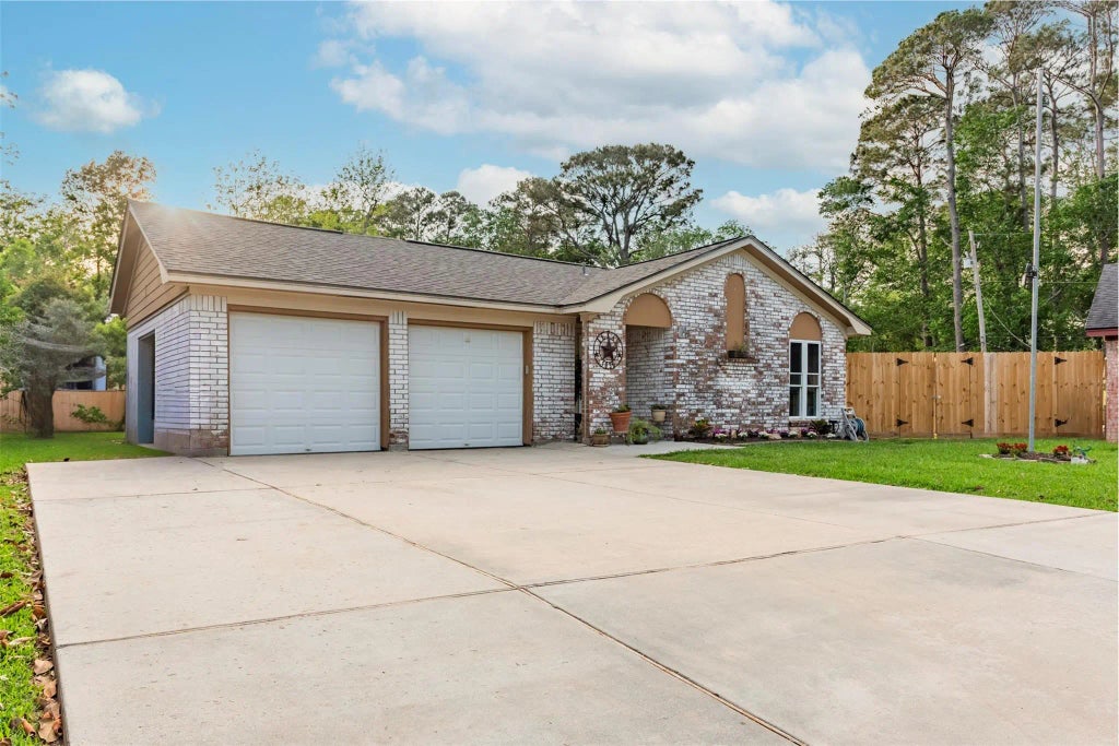 Tucked away on a peaceful cul-de-sac, this beautifully updated Dickinson home is packed with upgrades and charm! Step inside to find fresh paint, durable ceramic tile flooring, energy-efficient vinyl double-pane windows, and modern CPVC/PEX plumbing. The spacious living room showcases soaring cathedral ceilings, a cozy gas-log fireplace, and opens seamlessly to a bright 300 sq. ft. sunroom — perfect for relaxing or entertaining. The kitchen shines with crown molding and updated finishes, while both bathrooms feature granite countertops, copper sinks, 42" vanities, and elegant stone shower surrounds. Outside, enjoy a large concrete patio, extended driveway, handy storage shed, and a newly installed (within the past year) wood fence. Major updates include a new roof (within the year), a new garage door with keypad entry, and a AC unit less than 10 years old. No HOA! Refrigerator and washer/dryer excluded.