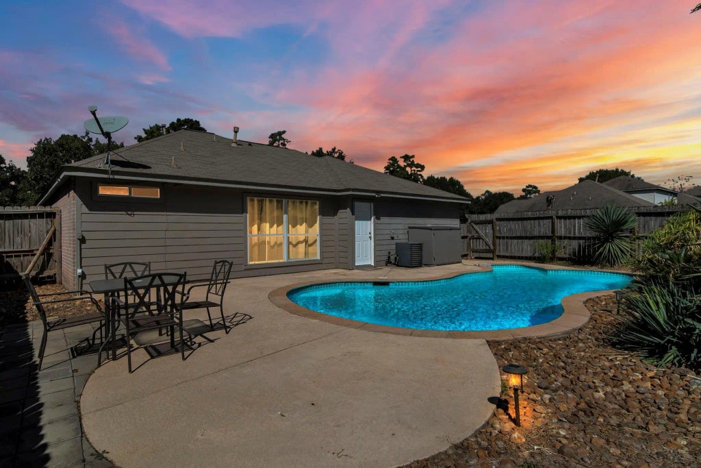 Single story 3 bedroom, 2 bath home with a POOL across from Willis High School. Beautiful formal entry awaits your decor when you enter the front door. The living room is spacious providing plenty of room for your furnishings. Appreciate the kitchen details- full size refrigerator, gas stove/oven, dishwasher & microwave with an island for additional counter space to prepare meals & 2 pantry spaces. Primary bedroom has high ceilings & large windows with black out curtains included. The primary bathroom has two sinks & large soaking tub with access to the huge walk in closet. Secondary bedrooms located on the west side of the house both w/ceiling fans & carpeted flooring. Secondary bathroom is located near living room & secondary bedrooms. Laundry area is located near dining room including full size washer and dryer. Two car garage has storage shelves and containers included. Cool off during the warm days by swimming in the pool, beautifully landscaped w/patio set included.