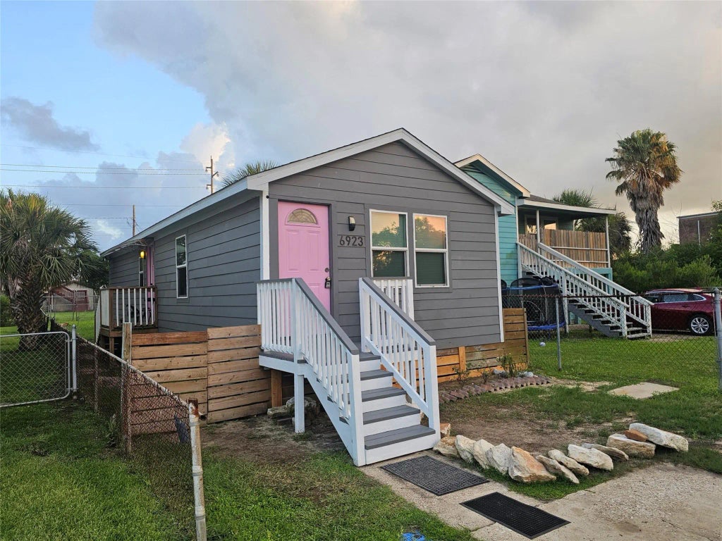 Charming Galveston Cottage with modern updates and an open floor plan. This adorable home offers a spacious Living/Dining/Kitchen area, 2 full baths, and vinyl floors that resemble wood. The 1 bedroom at the back provides lovely backyard views. While there's no garage, the alleyway offers potential for one. The property includes the remains of a torn-down storage room, offering the opportunity for reconstruction. The large yard adds to the charm of this wonderful home.