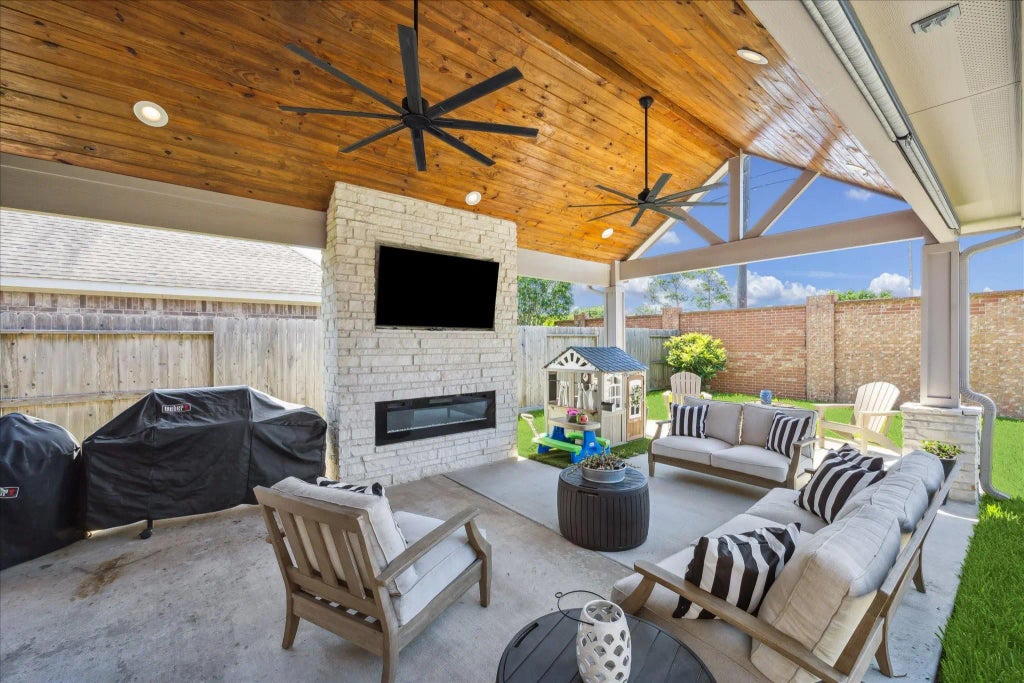 Gated community in League city, minutes to I45, 3 car garage, beautiful brick and stone curb appeal, sprinkler system, community has a private boat ramp and walking trails. Gorgeous vaulted covered patio with fireplace!! Kitchen has granite counter tops, "farmhouse" stainless steel skirt sink, tumbled marble back splash, hardwood flooring, 2 story living room with fireplace, open floor plan, kitchen opens to living room, huge game room, primary bedroom with high ceiling, double sinks his and hers closet. No neighbors behind - private back yard!
