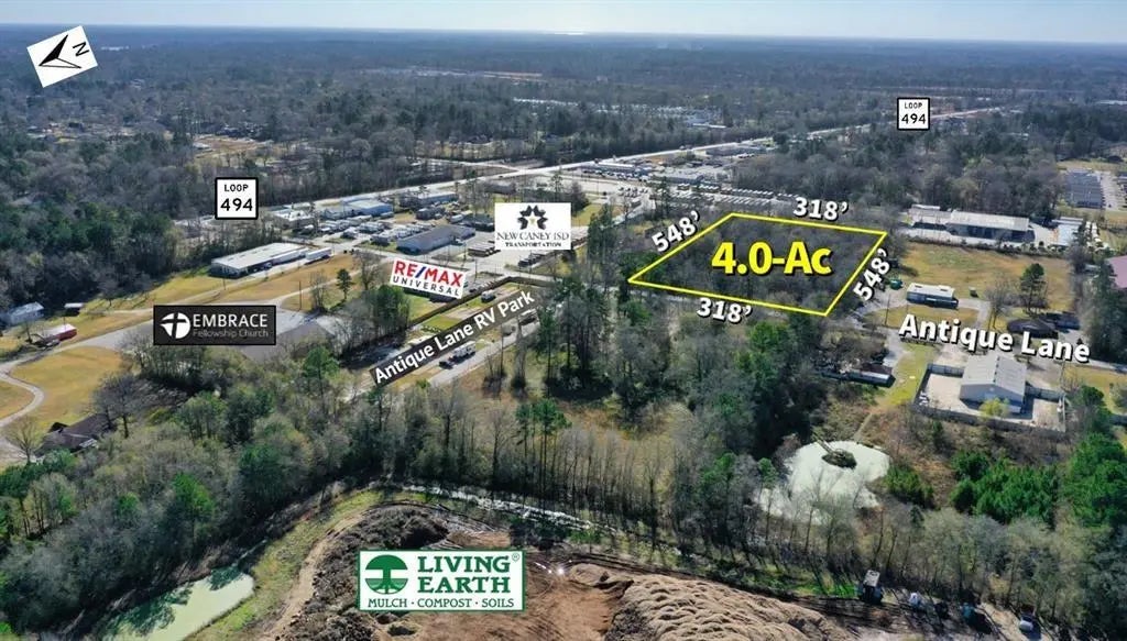 4-Ac lot, 800 feet from Hwy 59, with excellent frontage on Antique Lane, a great location with easy access to Hwy 59, Loop 494 & FM 1485. Public water, sewer, and electricity. Finished the design and permitting for a 50-spot cabin park, RV park or mobile home parks.! Seller can be a partner of a new developer!