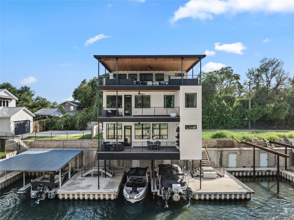 Welcome to your dream waterfront retreat! This exquisite 3-story, 5bed/3.5bath home offers luxurious, contemporary living in a beautiful & amazing recreational community on lake LBJ. This home is perfect for life on the water & hosting amazing memories with family & friends. The 1st floor greets you with an open, airy layout that seamlessly blends living/dining/kitchen with a large appealing waterside veranda & 1/2bath w/int.& ext. access. The 2nd floor holds 3beds/2baths a den & private balcony. The 3rd floor holds 2beds/1bath, a 3rd den/gameroom and a stunning, covered rooftop entertainment deck. For boating enthusiasts, this property includes two boat slips, making it so easy to enjoy a day on the water, or a sunset cruise! Don't miss this incredible opportunity to own a piece of paradise on the water! Schedule your showing today and experience the perfect blend of luxury, nature, and leisure! Lake level sustained year round. Starlink. Furnishings & Manitune tri-tune negotiable.