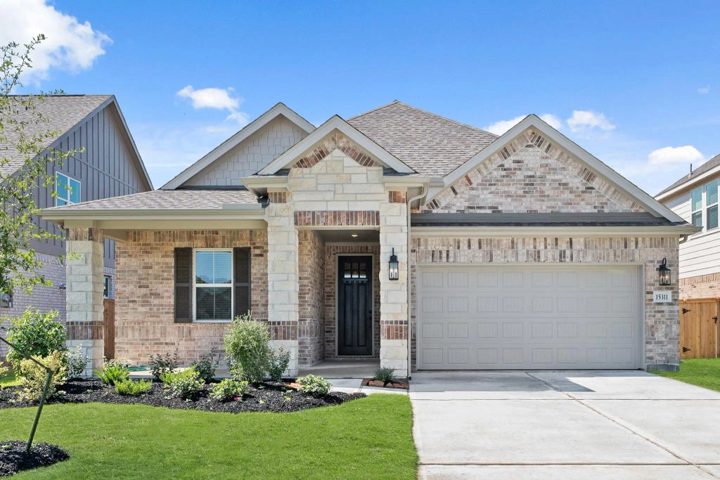Final Opportunity in Centennial Oaks! This stunning one-story Asheville Farmhouse offers 3 bedrooms, 2 baths, 2 car garage. A warm entry foyer with a custom feature wall sets the tone for stylish living. The island kitchen is a true centerpiece with sleek grey cabinetry, decorative floating shelves, and gleaming Carrara Morro quartz countertops. The open-concept layout flows into the great room, where soaring vaulted ceilings with stained beams create both space and character. The bright dining area, framed by natural light, invites gatherings and everyday meals alike. Escape to the serene primary suite, complete with an eye-catching accent wall and an oversized walk-in closet. The spa-inspired bath boasts dual vanities, a soaking tub, and a separate shower for the perfect retreat. Outdoors, a covered patio extends your living space for year-round enjoyment. Conveniently located near Hwy 6 and I-45, with low taxes and quick access to shopping and dining.