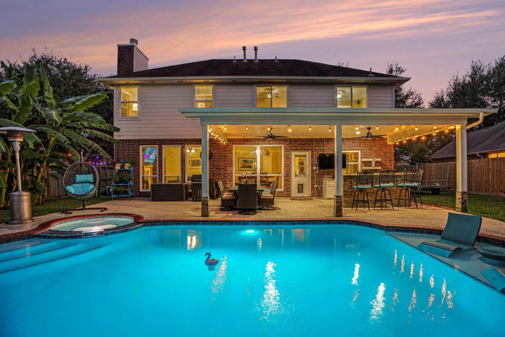 Welcome to 3228 Crimson Coast Drive! Make this your home and vacation away all-in-one! This home offers a perfect blend of comfort and entertainment - high-end finishes, open floor plan, game room down, and a backyard oasis complete with pool, hot tub and covered patio with wet bar! Recent updates include paint, windows, kitchen reno with island breakfast bar, rich stained cabinets and granite countertops, Master bath reno with new shower, granite countertops, cabinetry refaced, lighted mirrors, tiled accent wall, tile flooring, second bath ... LVP or tile throughout - NO CARPET! Both HVACs replaced in 2024. The pool is large enough to host volleyball, and the built-in hot-tub is perfect for everyday use. Luxurious tropical landscaping front and back. Whole-house Generac for power backup! Oversized gate access perfect for securing toys in your own backyard. This property is a true gem for those looking for a stylish and relaxing retreat. Book your appointment to view today!