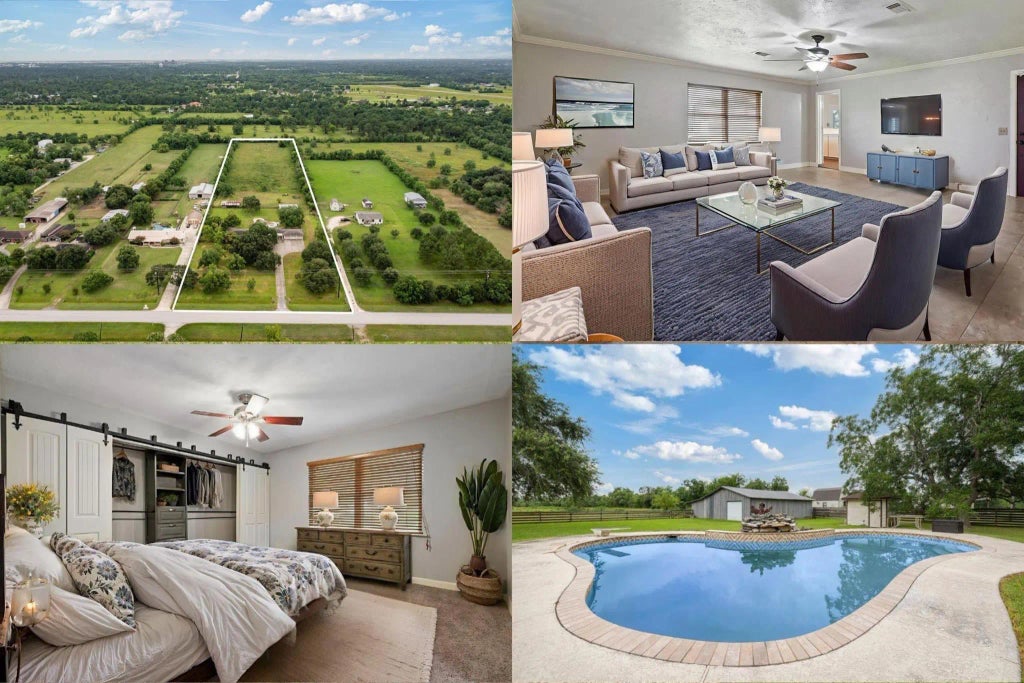 Welcome to your peaceful retreat on nearly 5 acres of serene Texas countryside! This one-story ranch-style home invites you to relax, recharge, and reconnect with nature. Nestled under mature trees, the home offers a refreshing pool, long paved driveway with space for 6–8 cars, and room to roam—ideal for hobby farming, 4-H projects, or simply enjoying the great outdoors. The property features a fenced area for livestock and the potential to lease approximately 2 acres as pasture land. Step outside for cozy bonfire nights with friends, or explore future possibilities with the land. Inside, the layout offers plenty of space to customize and make your own. Located just 5 minutes from shopping, dining, and conveniences, with easy access to I-10 and top-rated schools nearby. Enjoy the fun of Pirates Bay Waterpark and a low 1.9% tax rate—all while embracing quiet country living. Don’t miss your opportunity to create your dream space in this rare, versatile setting.