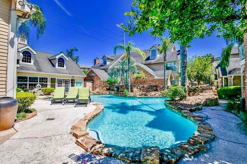 Available for immediate move-in! Great ground level condo in the desirable Riverwalk Community and located in the heart of Houston. Two primary bedrooms have ensuite baths. Laminate wood flooring throughout including bedrooms(no carpet) and cozy fireplace. Washer, Dryer and refrigerator included. 24-hour manned gate security at the front gate, 3 pools, clubhouse, fitness facility and water included! Sliding glass doors lead to an ample patio. Conveniently located across from the VA hospital, easy access to 610 and minutes away from TX Medical Center, Rice University and Museum District, NRG Stadium, Herman Park, trails and restaurants.