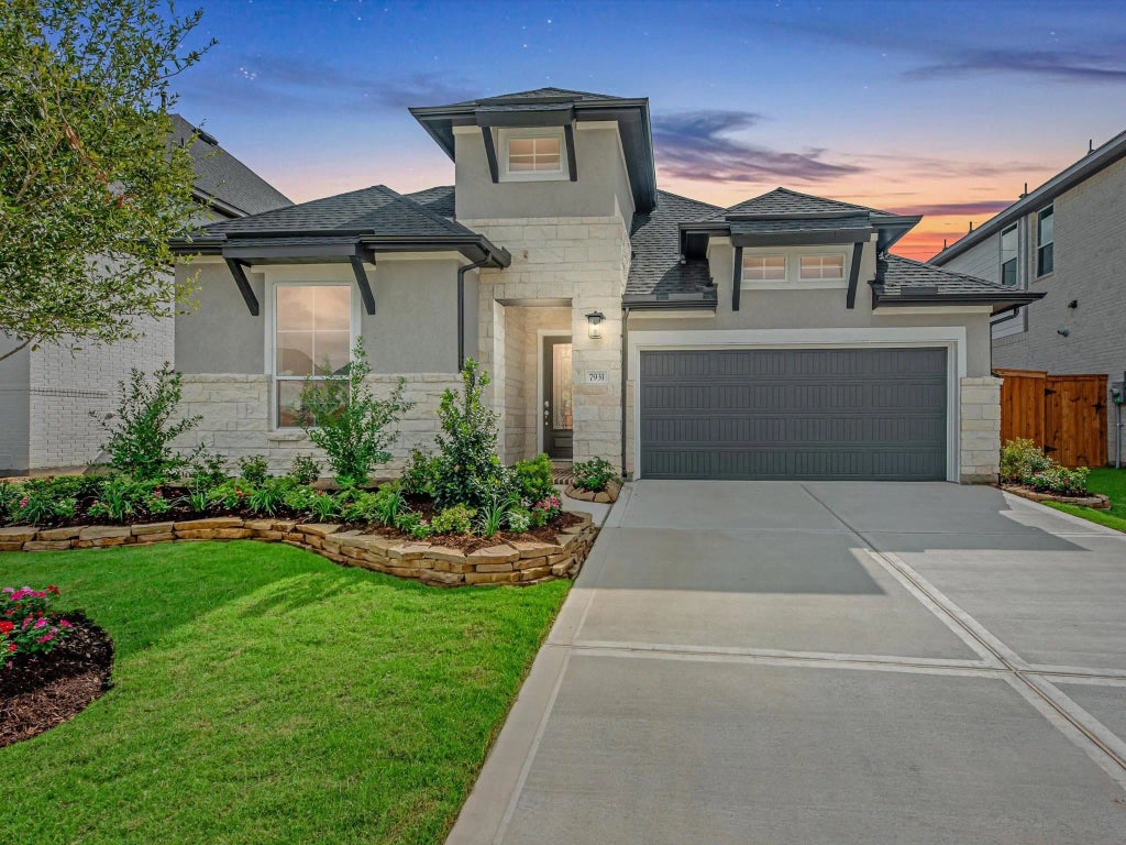Tri Pointe Homes' modern Stone and brick home with four bedrooms, three baths, and a one-story residence is on an oversized lot. This home boasts a spacious open living area with vaulted ceilings, accentuated with an electric fireplace with floor-to-ceiling tile surround. The main living area seamlessly connects to a well-appointed kitchen with built-in appliances and sleek quartz countertops. The home features four bedrooms, a secondary bath with a walk-in shower, and a designated study designed to offer comfort and privacy. The primary bedroom is a serene retreat, boasting large windows overlooking the backyard, a walk-in closet, and an en-suite bathroom with luxurious amenities such as a spa-like stand-alone tub and a separate shower. Stepping outside, the property features a landscaped backyard with a patio area and sprinkler system.