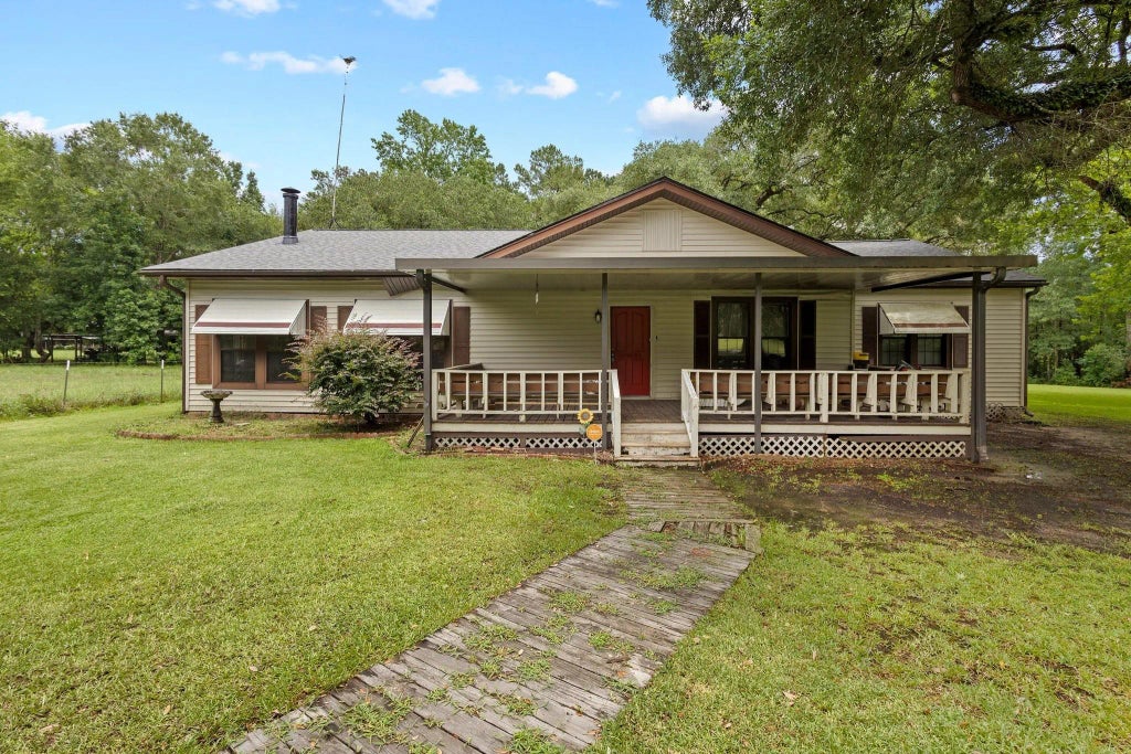 Come enjoy the peace of country living! This spacious 4 bedroom home sits on almost 5 acres, and has a covered front porch, french doors in the large primary bedroom leading to a back porch, and a screened in porch off of the kitchen give you ample places to relax and enjoy your coffee and the serene landscape and oak and pecan trees. The natural elements of pine with the gorgeous stone fireplace in the living room provide a rustic and cozy atmosphere. This home has a 5 car garage and workshop giving you plenty of space to store a boat, trailer, tractor, ATV and has electricity to work on weekend projects! The home was leveled in 2024, and a new roof and AC unit were installed in 2025. Spacious with tons of storage on 5 acres, this could be your home sweet home!