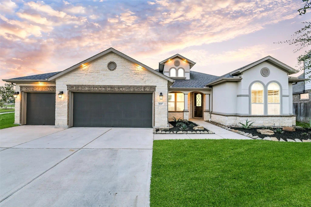This prime location on the water in Amira is the ideal setting for this 3 bed, 3 bath, full 3 car epoxied garage home with gorgeous Mediterranean elevation and huge lot. From a front study with French doors and formal dining with trayed ceiling, the warm wood look tile flows to an expansive living room with built-in shelves and custom stacked rock electric fireplace. Windows grace the entire back wall of the living room and surround the breakfast room, providing ample natural light and beautiful waterfront views. The kitchen also benefits from those windows, as well as an oversized island with breakfast bar and pendant lighting, extensive granite counters and cabinets, gas cooktop, butler's pantry, and large walk-in pantry. With more views to the water, the generous primary bedroom suite features trayed ceiling, double sinks, oversized shower, and large closet. The sweeping backyard and extended porch present many possibilities, room for a pool and more. This is a home sure to impress!