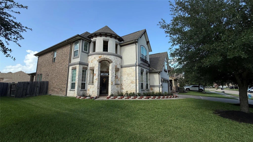 This beautiful home is located on a quiet cul-de-sac and features a striking entrance with a turret design. Highlights include a grand double-height entry and living room, a covered patio, a spacious backyard, and an open floor plan. Additional spaces include a dedicated game room, office, and a media room prewired for surround sound. The home has two AC units and two water heaters. New AC (6/2025).New E-poxy Garage floor Double-pane windows. Elegant iron spindles. Extra storage in the entry closet extends under the stairs, as well as a linen closet upstairs. The primary bedroom is conveniently located on the main floor, the additional bedrooms are upstairs. This comfortable "castle" offers unique design elements such as an art niche, built-in cubbies, and arched openings. Neighborhood amenities include a recreation center with a pool, playground, splash pad, and several walking paths connecting pocket parks and play areas. Treat yourself like royalty and make plans to own this castle!