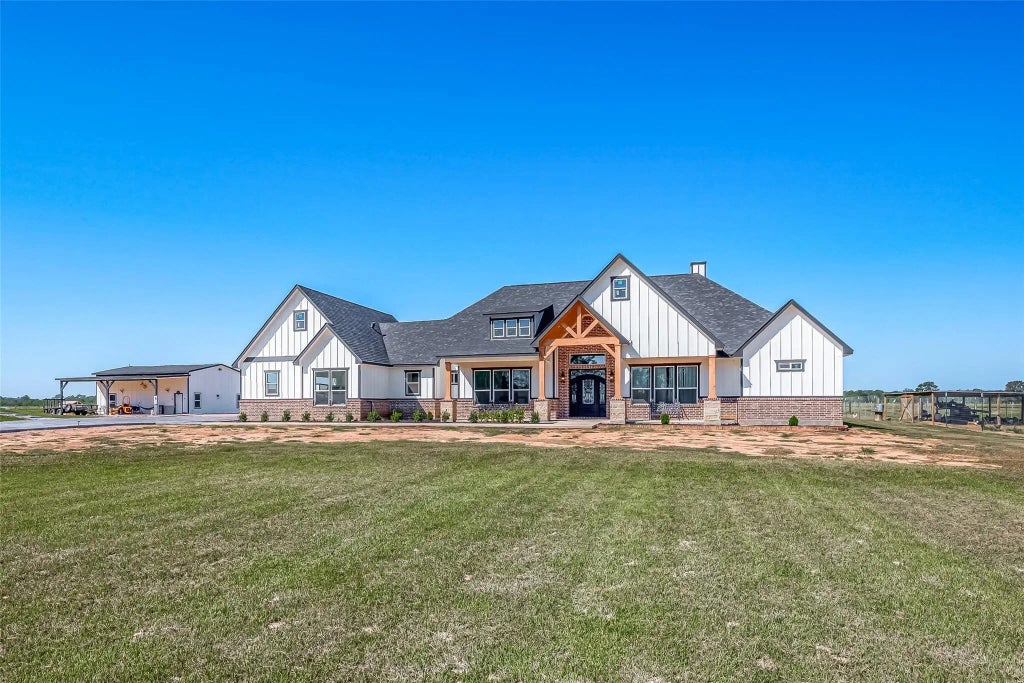 Nestled on an expansive 11-acre lot, this exquisite estate epitomizes refined living. The grand 4019 sqft residence boasts a meticulously designed 5-bedroom, 5 1/2-bathroom layout, characterized by high ceilings and impeccable proportions. Guests are greeted by the allure of spaciousness, leading seamlessly into the heart of the home—a dream kitchen adorned with quartz countertops and ample cabinetry. A 3-car garage offers both convenience and functionality. Stepping outdoors, a captivating patio oasis beckons, complete with an outdoor kitchen sink and fireplace. The lovely master suite, featuring a double sink vanity, a grand walk-in shower, and a rejuvenating hot tub, complemented by a generously sized walk-in closet. A charming guest house awaits, boasting a well-proportioned patio, two inviting bedrooms, and a thoughtfully designed bathroom. Ascending to the upper level reveals a peaceful loft space, while the open-concept living area seamlessly integrates with a modern kitchen.