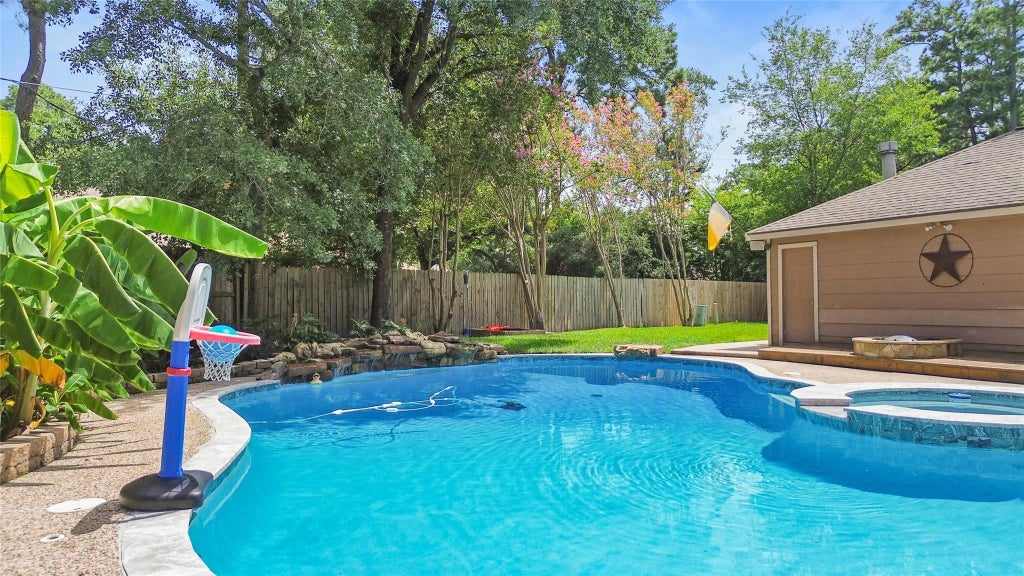 Welcome to this spacious 4-bedroom, 3.5-bath home on a large wooded lot in the highly sought-after Terranova West community. The highlight of this property is the private backyard oasis, featuring a sparkling chlorine pool, relaxing spa, and a full outdoor bathroom—perfect for entertaining or unwinding year-round. Inside, the home offers over 3,000 sq ft with a recently updated interior, including fresh paint and new laminate flooring in the living, dining, and primary bedroom. The layout includes a large island kitchen, formal dining, and a generous living room with pool views. The primary suite is downstairs, with a game room and three additional bedrooms up. The foundation has been professionally inspected and repaired as recommended. Complete with a 2-car detached garage, sprinkler system, and mature trees, this home delivers comfort, space, and resort-style outdoor living in one impressive package.