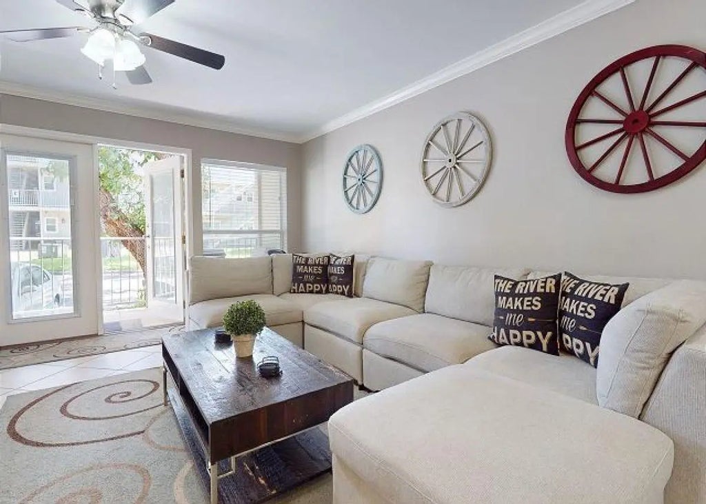 DEEP IN THE HEART OF TEXAS HILL COUNTRY. MUST SEE THIS! 1st floor, corner, Waterfront property with private access to Guadalupe River! Stays w home: Stainless Steel appliances, Refrigerator, Microwave, Stove & Dishwasher. Fuel efficient Gas Water Heater, Gas Furnace. Exquisite Granite kitchen exhibits that WOW Factor that is carried though-out this generously spacious home. Over-size corner covered Patio, 2 swimming pools & 4 hot tubs, picnic tables, BBQ Grills along the greenbelt. Outdoor Fire pits throughout. Craftsmanship shows stunning modern Open-Floor Plan. Blinds throughout, ceiling fans, walking trail, Recognized New Braunfels ISD, A/C serviced every 6 months. Recent element changed in water heater. Washer/Dryer stays. Tile floors throughout. Hardie plank exterior. HOA pays Insurance for structure & flood. Schlitterbahn & Well known Gruene Attraction close-by.