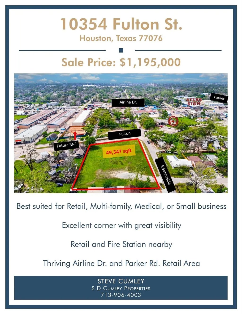 Corner lot is a booming Northeast area of Houston. Near the busy retail area at Airline Dr. and Parker Rd. Other retail near by along with a fire station next door.