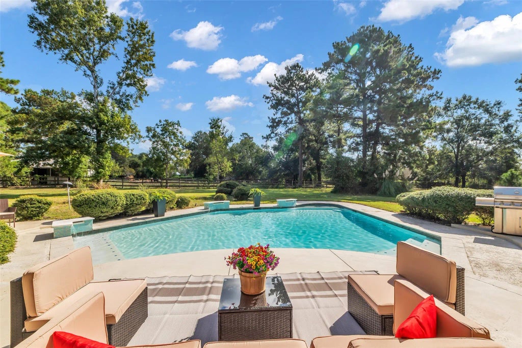 Pool has been replastered, and this home shows well! Nestled on a serene 3.46-acre cul-de-sac lot in the prestigious High Meadow Ranch community, this timeless beauty offers the perfect blend of luxury, space, and charm. Step inside to discover approximately 5,000 sq ft under one roof, featuring 5 spacious bedrooms, 3.5 baths, a dedicated study, formal dining, living room, and an upstairs game room—ideal for entertaining. The heart of the home is a large island kitchen and breakfast area, bathed in natural light and perfect for gatherings. The 23x28 garage apartment with a full bath and private entrance. Horse enthusiasts will love the 3-4 stall barn, complete with a separate driveway for added privacy and convenience. Freshly painted with hard surface flooring throughout, the home boasts a tall, inviting entry, crown molding, and abundant natural light that enhances its classic charm. Pool upgrades include-replastered, filters replaced along with hardware for the jets & main drain.