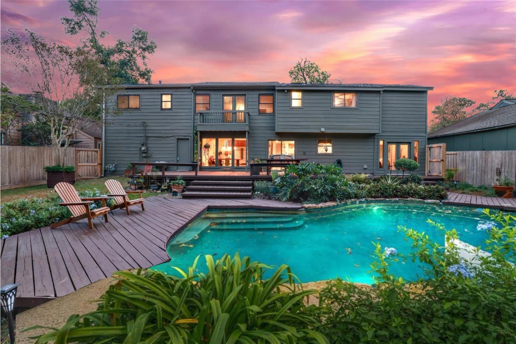Tucked away on a quiet cul-de-sac, this peaceful North Houston retreat offers a blend of charm, comfort, and modern updates, complete with a sparkling pool and beautiful views of the wooded greenbelt behind the home. Inside, you’ll find soaring ceilings + warm natural light. The home features an impressive list of upgrades: new roof, new condenser, freshly built fencing, and a restained wood ceiling that stretches dramatically from the living room to the upstairs office. The 2 upstairs bathrooms have been transformed! One with a new walk-in shower, open layout, new floors, walls, and vanity, while the other has a new vanity area, hardwood floor restoration, and removal of old carpet. One upstairs bedroom has restored flooring, fresh paint + new lighting. Other updates include the primary bath and two bedrooms upstairs, plus the outdoor living shines with a restored balcony and a wood deck with built-in benches. Perfect for relaxing under the trees or entertaining by the pool.