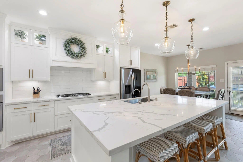 This stunning five-bedroom home features luxury vinyl flooring and fresh paint throughout. The grand spiral staircase complements the stone fireplace, creating an impressive entrance. The upgraded kitchen boasts quartz countertops, stainless steel appliances, soft-close cabinets, under-cabinet lighting, and a butler's pantry with beverage fridge, perfect for entertaining guests. The open floor plan connects the kitchen to the family room for seamless living. The formal dining room, with wainscoting, sits adjacent to a convenient office space. The spacious primary bedroom includes a ensuite with dual sinks, separate shower, and soaking tub for ultimate relaxation. Upstairs offers four additional bedrooms, a game room, and media room wired for sound. Outside features an extended patio, large backyard, landscape lighting, and sprinkler system. Additional perks include tankless water heater, e water softener, and 22-kilowatt generator. See you soon!