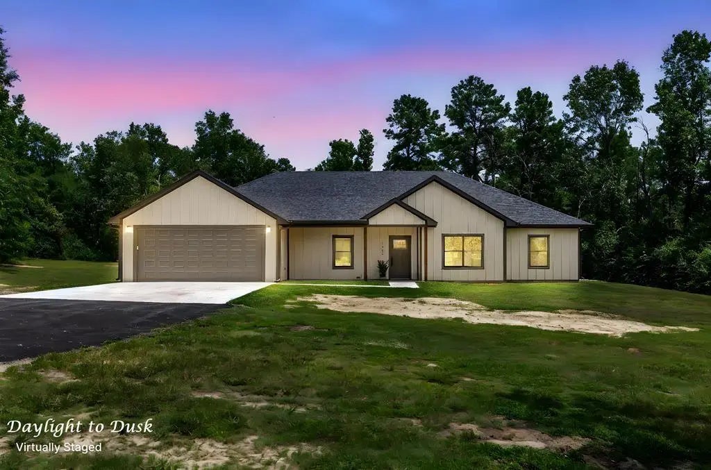 Welcome to this beautiful custom designed 2025 home in Pollok! Nestled on a spacious and private setting with 4.3+ acres of land in Central ISD. This brand new 4 Bedroom, 2 Bathroom home offers the perfect blend of modern luxury and peaceful country living. Step inside to a bright and open floor plan featuring a Huge Living, Dining, and Kitchen area with stunning boxed ceilings and custom modern lighting throughout. The kitchen is a showstopper with a large island, breakfast bar, sleek quartz countertops, tons of cabinet and drawer space, pot filler over the stove, new and trendy oversized pantry/laundry combo with additional cabinet and counter space! The split-bedroom layout offers privacy, with a luxurious primary suite that includes a soaking tub, step-in tiled shower, double vanities, and a spacious walk-in closet! It also features energy-efficient windows, tons of natural lighting, attached 2-car garage, and covered back patio with gorgeous natural view of the tree line!