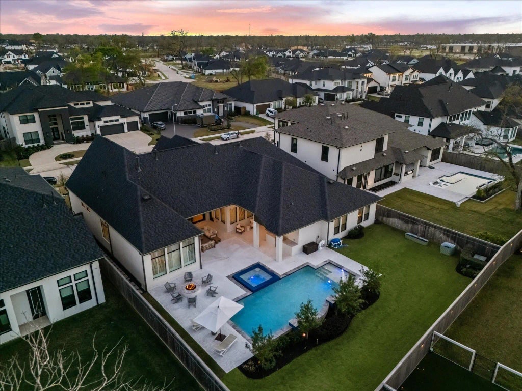 Discover this breathtaking, highly sought-after one-story home, designed for both relaxation and entertaining. Step into your backyard paradise, featuring a spacious pool, hot tub, outdoor kitchen, fire pit, and lush green space. Inside, soaring 17-foot cathedral ceilings welcome you into the study, while the family room boasts 14-foot ceilings and a sliding glass wall that seamlessly connects to the outdoor living area. Enjoy year-round entertaining with a wet bar refreshment area, a game room with an adjacent snack bar, and surround sound indoors and by the pool. The primary suite offers a private retreat, featuring a spa-like bathroom with abundant storage, an oversized shower, and a freestanding soaking tub. Each of the three additional bedrooms includes an en-suite bathroom and walk-in closet. Additional highlights include tankless water heaters, plantation shutters, an oversized 3.5+ car garage with space for a golf cart, attic storage and premium upgrades throughout.
