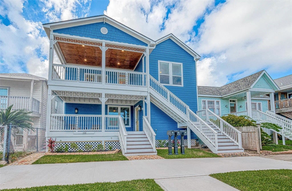 3 residences on one lot! 4 blocks to the beach. Rare multi-home property with luxury units, fully rebuilt from the studs up, including new electrical, plumbing, and gas. Elevated 13 ft above sea level (2023-24). The front 2-bed, 2-bath home, originally built in 1910, retains its stunning hardwood floors with spa-like primary shower and huge walk-in closet. Below, a beautifully designed 3-bed, 2-bath unit is ideal for an in-law suite, family use/rental, or Airbnb to accommodate many guests and maximize income. A separate 2-bed, 2-bath residence in the rear building overlooks a peaceful courtyard with dedicated alley access. On the ground floor, two garage units and a vacant shell space offer storage or potential for a fourth efficiency unit in the future. Each residence offers an expansive balcony or covered porch for alfresco dining or to simply enjoy the gulf breeze. Minutes from UTMB, Seawall, beaches, Pleasure Pier, and the Strand—an unbeatable East End investment!