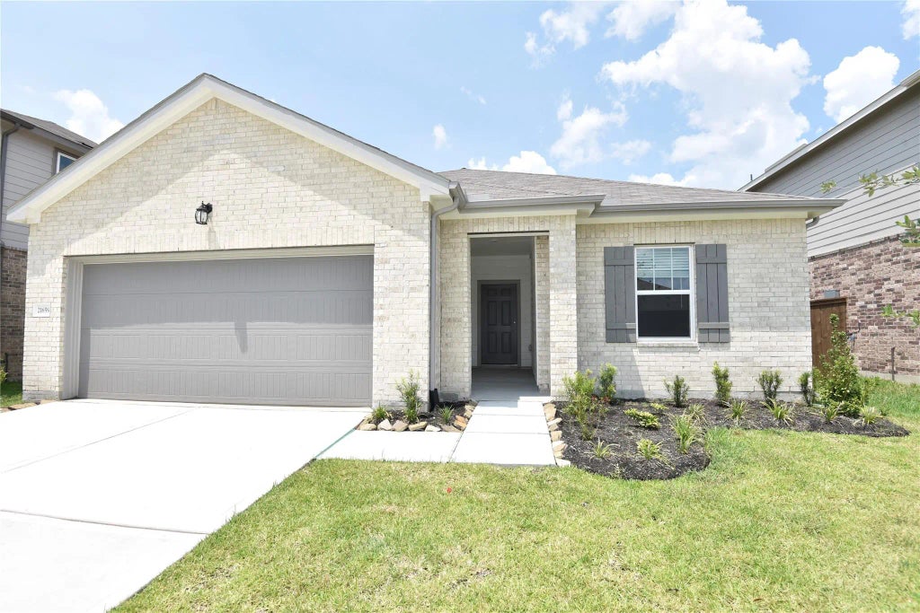 Brand-new single-story home in Harrington Trails offering 1,827 sq. ft. with 4 bedrooms and 2 full baths. The open Firefly floorplan features a spacious living area that flows into a modern kitchen with granite countertops, large island, walk-in pantry, and stainless-steel appliances. Home comes move-in ready with refrigerator, washer, and dryer included. The private primary suite offers an en-suite bath and walk-in closet, while secondary bedrooms provide flexibility for family, guests, or office space. Interior highlights include vinyl plank flooring with carpet in bedrooms, high ceilings, and energy-efficient Low-E windows. Exterior features include a fenced backyard with sprinkler system, patio, and a two-car garage. Community amenities include a pool, clubhouse, playground, and walking trails, all within a growing master-planned neighborhood. Convenient location with easy access to Hwy 59 and nearby shopping and dining.