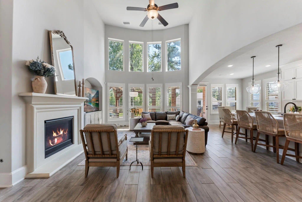 Versatile Westin home in Woodforest offers 4 beds, 3.1 baths and 2-car attached garage with 5-ft extension, showcasing energy-efficient design and luxury finishes. Step through the 8-ft front door into breathtaking tiered rotunda with wrought-iron curved staircase. Private study with 8-ft double doors complements the open layout, while Ventura Plank tile flooring and large base trim enhance the custom feel. Formal dining room flows into the open living room with dramatic 2-story wall of windows, connecting seamlessly to the dream kitchen featuring SS appliances, quartz countertops, modern cabinetry, Texas-sized island and breakfast nook. Primary suite offers trayed vaulted ceiling and spa-like bath with dual sinks, corner soaking tub, separate shower and walk-in closet, plus secondary bedroom downstairs. Upstairs includes spacious game room, media room, two bedrooms and Hollywood bath. Outdoors, enjoy the extended covered patio, pergula and backyard designed for entertaining.