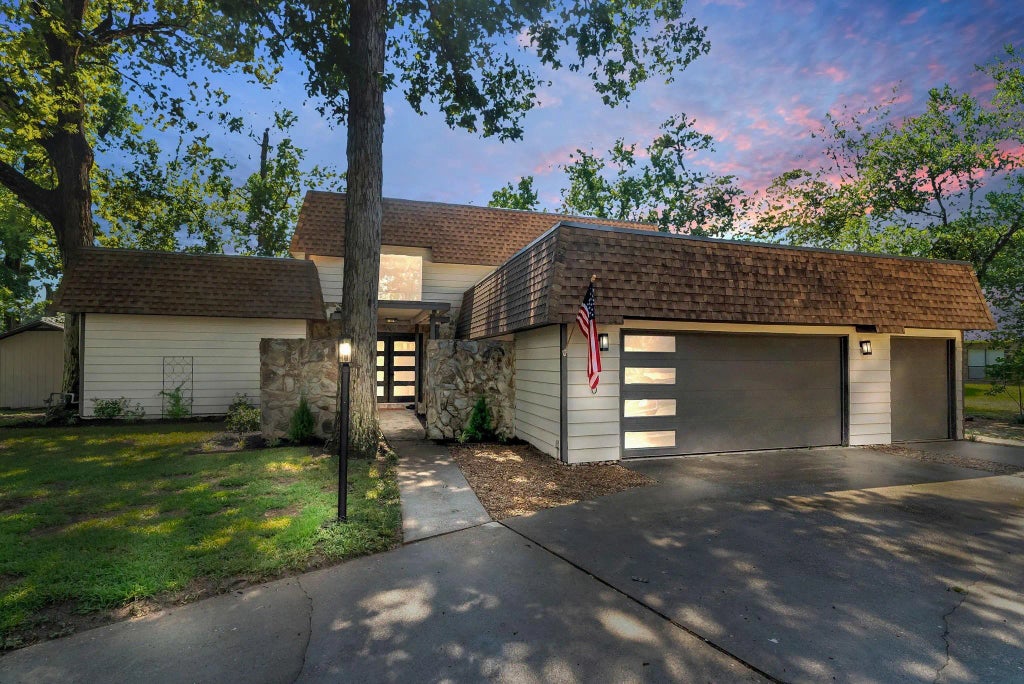Full of character and modern rustic charm, this remodeled Mansard-style home on the golf course in Panorama Village is a true showstopper. Soaring 2-story living & dining with dark beams, floor-to-ceiling stone gas fireplace, and panoramic fairway views. The kitchen features quartz countertops with white shaker cabinets, matte black hardware & new appliances. Also there's a newly created loft above with modern horizontal railed staircase. Primary suite offers a custom accent wall, glass barn door to spa bath with rain head shower, soaking tub, and privacy glass to enclosed courtyard. The courtyard has a newly built stone paver and fire pit area. Two screened porches—main off living and private sleeping porch off primary. Light oak LVP floors, remodeled secondary bath, fresh paint, stone-accent entry with mahogany double doors, and refreshed landscaping complete this modern rustic retreat. This is more than a home—it’s a lifestyle on the course.
