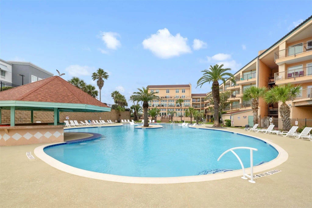 This beachside condo retreat is a great successful short term rental! This beautiful one bedroom / one bath sleeps 5, with a single bed in the alcove and pull-out couch. Unit faces east, ensuring mesmerizing sunrises over the Gulf. Wood-style tile flooring. Plenty of kitchen storage, which includes granite countertops and a large breakfast bar. Large bathroom with oversized step-in shower. Surrounded by lush tropical landscaping, this property creates a serene ambiance complemented by amenities such as 3 pools, a hot tub, fitness center, and a convenient pet shower area. Located just across the street from the beach and near the iconic Pleasure Pier, indulge in a myriad of activities and attractions including amusement rides, world-class dining, and boutique shopping.