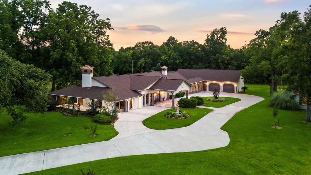 Welcome to 1043 FM 1011, situated on 10 acres of pristine countryside, this exceptional estate offers nearly 7,000 sqft of refined living space where elegance meets functionality. Featuring 3 spacious en-suite bedrooms and 5 full baths, the home has been recently enhanced with a new roof, aerobic system, fresh exterior paint on the main house, barn with apartment and horse stalls, and guest house. Inside, travertine and hand-carved wood floors, 2 full kitchens, wet bar, and custom wine grotto elevate everyday living. Step outside to a resort-style oasis with a saltwater pool, outdoor kitchen, and fireplace—ideal for year-round entertaining. Equestrian enthusiasts will appreciate the expansive grounds with horse stalls, generous storage, and fully equipped apartment within the nearly 7,000 sq ft barndominium. This home includes a whole-home generator, providing seamless backup power. Enjoy the charm of small-town living and convenience of being just a short drive from Houston.