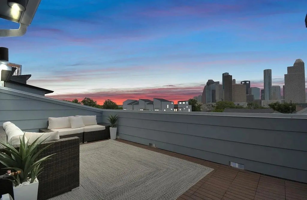This four-story masterpiece blends bold architecture with sweeping skyline views. The dramatic two-story foyer, where a floating staircase sets the tone for sleek sophistication. The open-concept living room flows onto a spacious balcony, while the chef’s kitchen impresses with a large island, European-style cabinetry, and quartz countertops. The third-floor owner’s suite showcases breathtaking skyline views and a spa-inspired bath with a freestanding tub and oversized walk-in closet. Secondary bedrooms feature en-suite baths and generous storage. A versatile flex space offers unobstructed views—ideal for an office, bar, or fitness area. The fourth-floor rooftop terrace delivers the ultimate entertainment space, complete with downtown views and hookups for gas, water, and TV. Additional features include European oak wood floors, smart home upgrades, and a private driveway. Located in the heart of Houston, you’re steps from Buffalo Bayou Park, dining, and minutes from downtown.