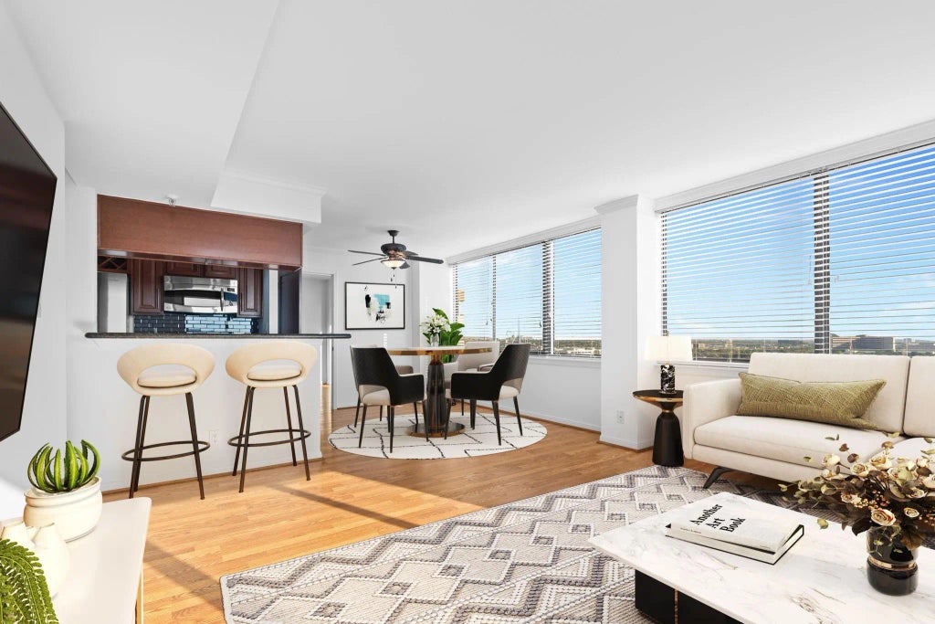 Experience luxury living at this beautiful corner condo on the 16th floor with amazing views of the city!! Don't miss this opportunity to live in the heart of the Galleria! Abundant natural light flows through this entire condo that is loaded with big windows. Lovely updated kitchen with modern backsplash, new laminate wood floors and freshly painted makes this unit ready to move in. Enjoy the inviting open floor plan with city views plus a nice size balcony to enjoy some outdoor living with amazing views from the 16th floor. 2nd bedroom has a beautiful French door that opens to the living room but can be used as an office as well. Washer, dryer and refrigerator are included. 24-hour concierge, library, billiards, fitness, resort style pool with jacuzzi and assigned parking with gated garage are only some of the great amenities. Utilities billed separately.