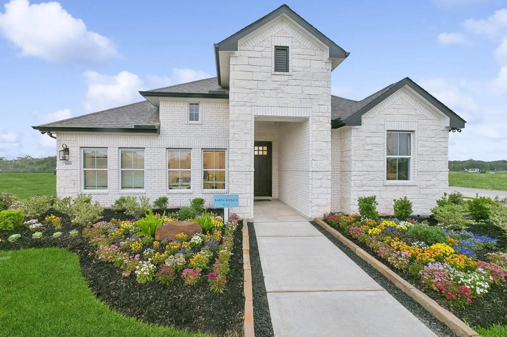 Former Model Home! Discover the charm of Centennial Oaks with this beautifully designed one-story Farmhouse Look on a desirable corner lot. Featuring 3 bedrooms, 2.5 baths, and a 2-car garage, this home blends style and comfort at every turn. A welcoming covered porch opens to a light-filled foyer highlighted by a designer feature wall. The gourmet island kitchen boasts crisp white cabinets, Soapstone Mist quartz countertops, and chic floating shelves, flowing seamlessly into the dining area and spacious great room. Soaring vaulted ceilings with rich stained beams create an inviting centerpiece for everyday living and entertaining. Retreat to the serene primary suite, enhanced with a custom feature wall and spa-like bath with dual sinks, a freestanding tub, and sliding barn door. Step outside to a covered patio designed for relaxation and gatherings. Ideally located near Hwy 6 and I-45, with quick access to shopping, dining, entertainment, and the benefit of low taxes.