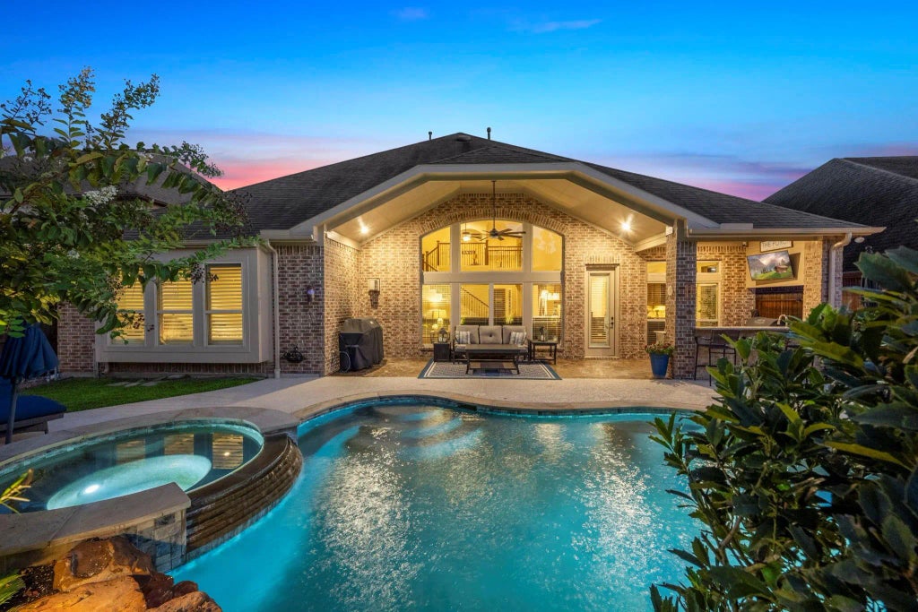 Stunning 4-bed, 3.5-bath home in the gated community of Wildwood @ Northpointe, offering 3,867 SF of refined living. Gourmet kitchen features maple cabinets with pullout trays, Santa Cecilia granite, tumbled stone backsplash, undercounter lighting, and custom pantry. Elegant interiors boast African Ebony hardwoods, plantation shutters, framed mirrors, custom built-ins by Cutting Edge Closets, and a mahogany door with wrought iron. Study with ceiling beams, dining with wine/coffee bar, and spacious family room with surround sound prewire elevate the home. Primary suite offers a custom closet and spa-inspired bath. Exterior paradise includes pool, spa, firepit, outdoor kitchen with bar, sink, refrigerator, and covered patio with TV. Flagstone deck, lush landscaping, and 3-car garage complete the space. Additional highlights: whole-home 24kw generator (2024), mudroom, dual walk-in attic storage, and included appliances. Built 2016, impeccably maintained, move-in ready luxury.
