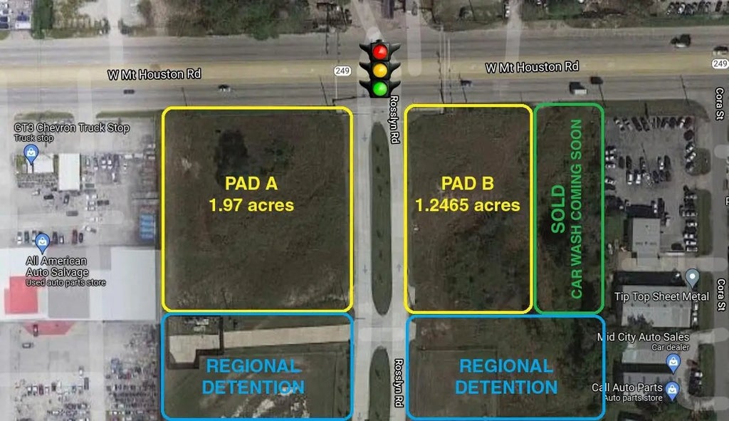 Pad A: 1.97 acre corner pad site at traffic lighted intersection on West Mount Houston Road (Hwy 249) and Rosslyn Drive. Pad site is available: for sale, for ground lease, or build to suit, Regional detention in place. Estimated 47,000+ vehicles per day pass by! Neighboring tract sold to car wash, coming soon in 2022! Corner lot with a traffic signal, perfect for commercial use. Opposite corner pad site for sale separately. Garcia Middle School behind detention drainage area, satisfying TABC distance requirements. Seller is willing to subdivide for a National Ground Lease. Ideal fast food, gas station, local market, retail center, or day care site. Minutes from I-45 and Veterans Memorial Drive.