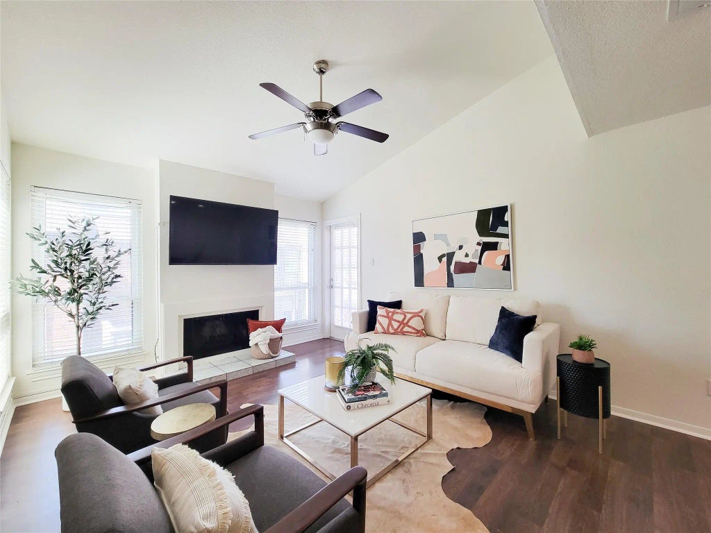 Fabulous 2nd floor end unit condo (no upstairs neighbors!) features 2 spacious bedrooms, 2 full baths & RARE attached, oversized 2-car garage (with private interior stairs) in a condo community adjacent to Tanglewood! Great floor plan with vaulted ceiling in the den, WB fireplace & wood-look laminate flooring throughout. No carpet! Kitchen has SS appliances (DW 2025), fridge, granite counters & full pantry. Renovated en suite primary bath w/walk-in shower. Primary bedroom has 2 spacious walk-in closets. Garage features stairs with new carpet (2025) & full-sized washer & dryer (included). Double-paned windows & sliding door in 2nd BR (2022 per seller). HVAC & ductwork 2023 (per seller). Washer, dryer, fridge & 2 TVs stay! HOA fee ($490.94) includes basic cable TV, water, exterior building & insurance, trash pickup & community pool + clubhouse. Ample storage & attic access in garage. Great location back courtyard close to the community pool. Walking distance to restaurants YMCA & parks!
