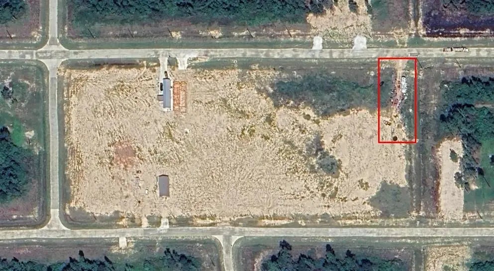 The property is a cleared residential lot located in the rural subdivision of Santa Fe Section 13 in Cleveland, TX. It features level terrain with established access via a county-maintained gravel road (Road 5894). Utilities such as electricity and water are available or nearby, making it suitable for a manufactured home or new construction.