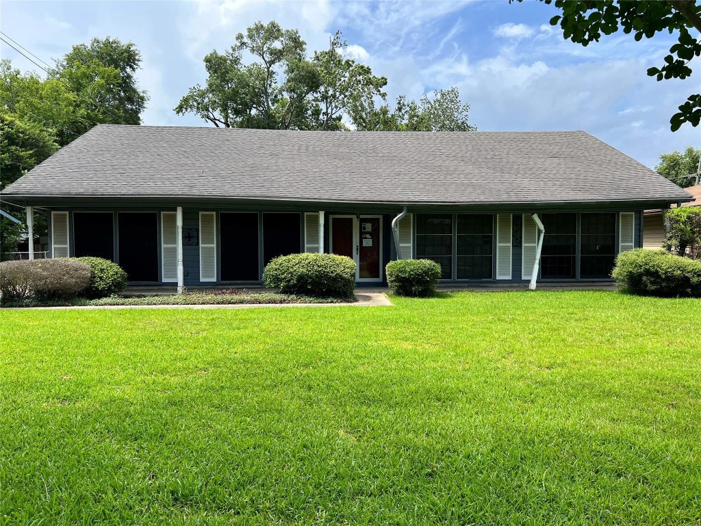 Spacious single-story home featuring multiple living areas, built-in shelving, and large windows offering ample natural light. The property includes a generously sized kitchen with vintage cabinetry and a central peninsula layout. There are two full bathrooms with original tile work and extended countertops. Bedrooms are well-proportioned, and one features built-in closets and ceiling fan. The home has a detached two-car garage, a large driveway with extra parking space, and a covered front porch. The yard is sizable with established trees and shrubbery.