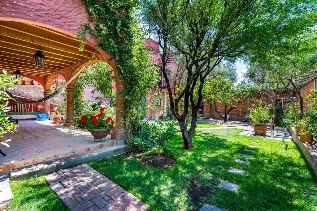 Offering lifestyle fit for a Prince, Casa Purple Rain—so named not only because it satisfies your wanderlust cravings, but also boasts a purple façade—offers one level living with city-wide views high above San Miguel de Allende in the upscale Rinconada de los Balcones, adjacent to the botanical garden and perched at the very end of a quiet traffic-free cul-de-sac. Garden lovers and pet owners will revel in this gated lot green space rings the home—that not only boasts a cornucopia of a fruit-tree orchard and fountain-anchored lawn area but also connects to an adjacent greenway belt landscaped as a neighborhood garden Crossing an entry bridge, visitors arrive in an oversized boveda-topped foyer opening to living areas to one side and the primary suite and service quarters to the other side, wrapping central terrace and overlooking the gardens below on the downhill slope. Open on all four sides, this estate offers bountiful light in all rooms—Downstairs could almost serve as a casita