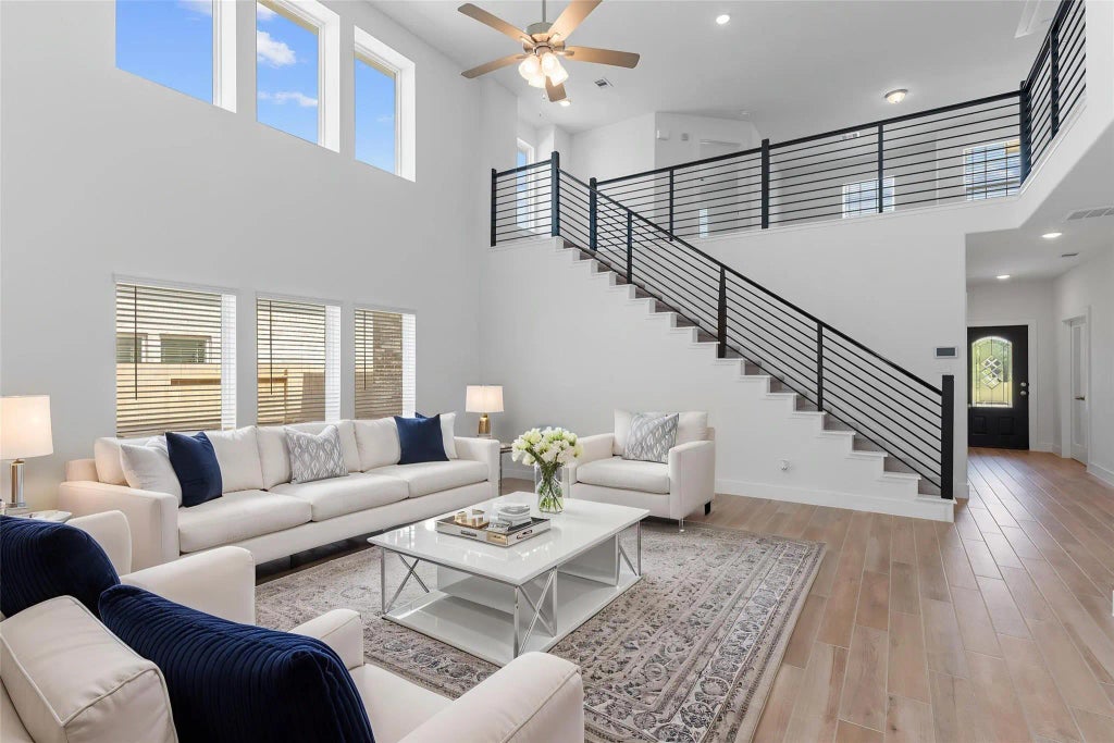 Trinity Floor Plan by CastleRock Communities! Resort lifestyle community with tropical Lagoon & more! Real 3 car garage! Front porch elevation! Stunning two-story entry! Upgrade beautiful tile like wood flooring! Home Office/Study features French glass doors! Dramatic two-story sweeping modern cable iron staircase, 2 story wall of windows in the family area that flows into the gourmet kitchen & casual dining! Gourmet Kitchen boasts tall white shaker cabinets, subway glass tile backsplash, island, stainless steel appliances, beautiful quartz counters, undermount sink, & more! Private Primary Suite with spa like bathroom & walk in closet! Upstairs, Game room, 3 guest bedrooms & more! Large, covered patio for outdoor fun & huge yard for your furry friends! Tankless Water heater! Enjoy small-town living in Dayton, TX, wonderful schools for all ages at the excellent Dayton ISD schools. Resort-style amenities make every day feel like a weekend with the Swim-Up Tiki Bar coming soon!