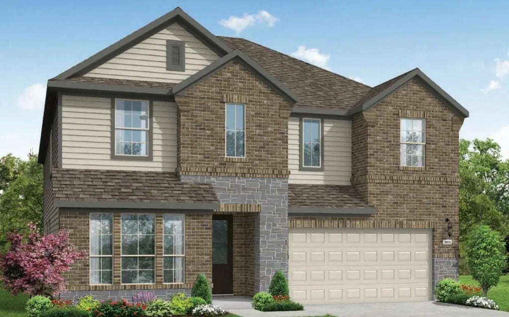This stunning stone and brick home offers a grand entry with soaring ceilings and an extended covered patio, perfect for outdoor entertaining. Inside, the open-concept island kitchen features tile flooring, a 10” deep undermount sink, a stylish backsplash, and stainless-steel appliances. The spacious master suite includes high ceilings, a bay window, and a spa-like bath with oversized shower, dual vanities, and a walk-in closet. Upstairs, a large game room provides extra space for relaxation or play. An upgraded glass-textured front door and full irrigation system complete this exceptional home.