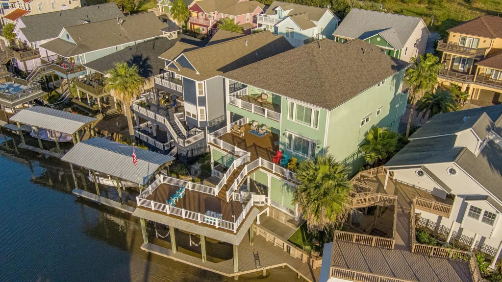 LUXURY WATERFRONT LIVING, FISHING, ENTERTAINING. This home is a MUST SEE for beautiful sunrises and sunsets. IMAGINE your boat and fishing right out your back door. Enjoy gathering with family and friends, entertaining with two chefs kitchens, three levels of deck/patio with PRIVATE BOAT SLIP ON THE CANAL. Sunlight permeates the living spaces. Soak in SPECTACULAR VIEWS OF GALVESTON BAY. Your massive second level kitchen, gathering, dining spaces on the second level provide room for all of your family or dozens of friends. Wake to aroma from the COFFEE BAR right outside your HUDGE THIRD LEVEL PRIMARY ENSUITE has a spa like bath, LUXURY COPPER TUB, DOUBLE WALK THROUGH SHOWER, and MASSIVE WALK-IN CLOSET. Ground level has a huge covered patio with chef’s kitchen, outdoor pool table and a full bathroom (great after a day on the water). UPGRADES, including an elevator, whole house generator, automatic hurricane shutters. Gated private amenities: fishing pier, pool, clubhouse and boardwalk.