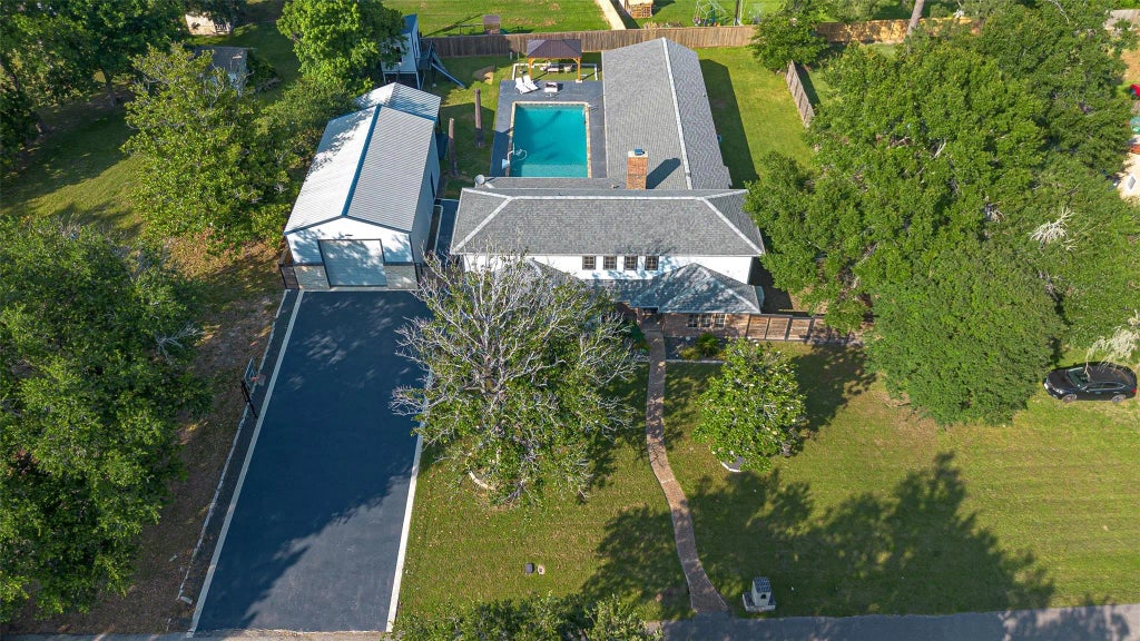 Just one block from downtown Magnolia, this 5-bedroom, 5-bathroom home offers flexible living and standout features. Enjoy a fireside living room with soaring wood-beamed ceilings, a formal dining room, and a granite kitchen with recessed lighting. The main level includes a spacious primary suite and a second ensuite-style bedroom, ideal for guests or multi-generational living. Throughout the home, barn doors, a home office, game room, and an oversized mudroom add character and convenience. Step outside to a fenced backyard retreat with a covered patio, detached pergola, and an in-ground sparkling pool—perfect for summer entertaining. An oversized detached garage offers additional storage or workspace. This home blends comfort, space, and style in a prime Magnolia location.