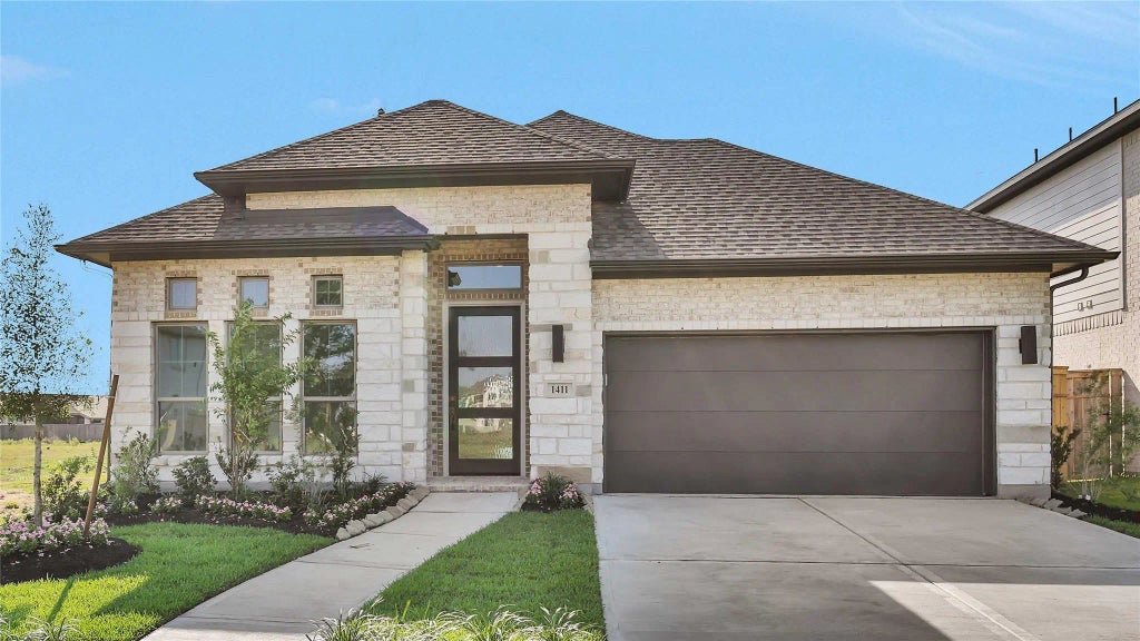 READY FOR MOVE-IN! Home office with French doors set at entry with 12-foot ceiling. Extended entry leads to open kitchen, dining area and family room. Kitchen features corner walk-in pantry, generous counter space, 5-burner gas cooktop and island with built-in seating space. Dining area flows into family room with wall of windows. Primary suite includes double-door entry to primary bath with dual vanities, freestanding tub, separate glass-enclosed shower and two large walk-in closets. A guest suite with private bath adds to this spacious one-story home. Extended covered backyard patio. Mud room off two-car garage.